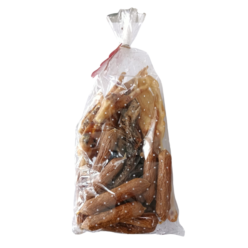Il "sacchetto" di Natale con coulisse e cordino raffigurante l'immagine del tuo cane è una confezione festiva che contiene una selezione di snack essiccati 100% naturali, ideale come regalo per il tuo cane.