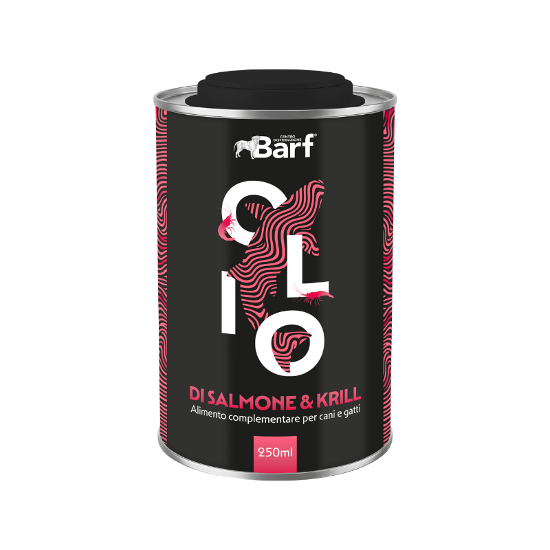 L’olio di salmone e krill è un alimento complementare naturale formulato per supportare il benessere quotidiano di cani e gatti, particolarmente indicato nelle diete BARF.